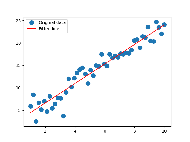 Linear least-squares regression fit (red line) to noisy data (blue dots)