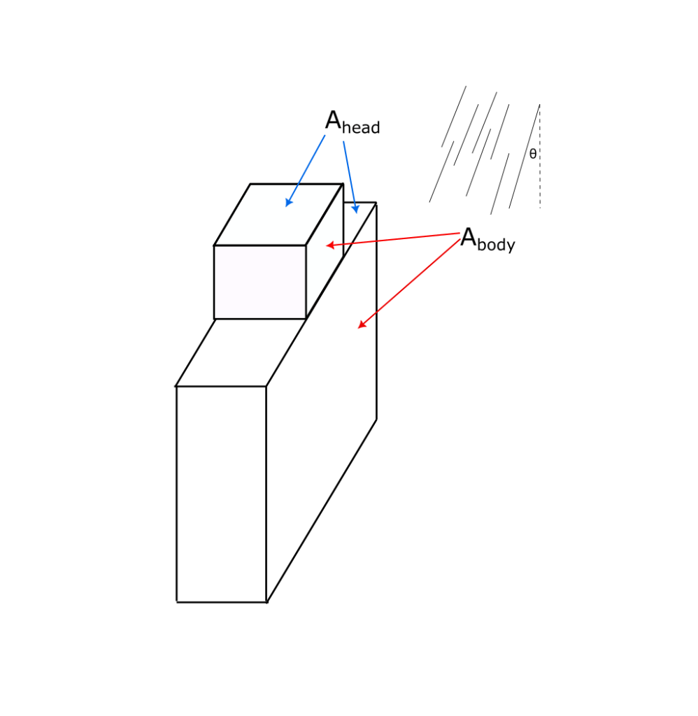 Two more things I can think of: Rather than get into the complexities of shape, we’ll imagine a human who’s kind of blocky in the sense that there are only two surfaces to consider: The top of the head, cross section (covering the horizontal surfaces of head and shoulders), and the front of the body, cross section