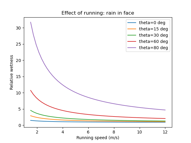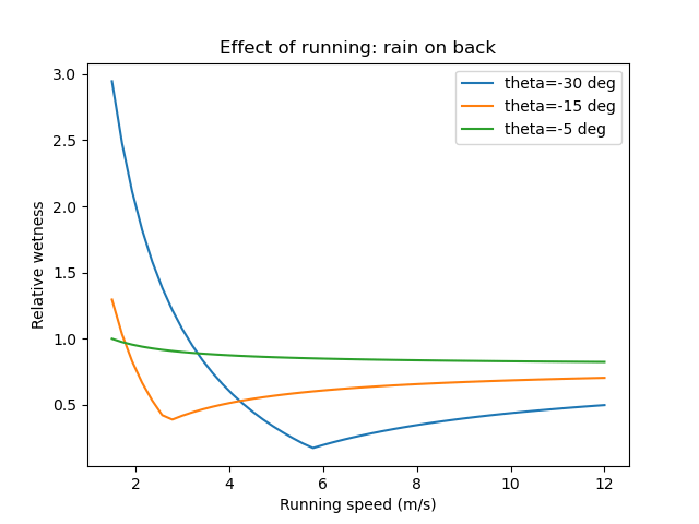 Here you can see that there’s an optimum speed. That’s going to be about where you’re keeping up with the horizontal speed of the rain, so from your point of view it’s falling straight down with almost none hitting your front or back. Run much faster than that, and you’re starting to run into the rain and actually making things worse. But up to the jogging pace of 3-4 m/s, you’re probably all right in most conditions.