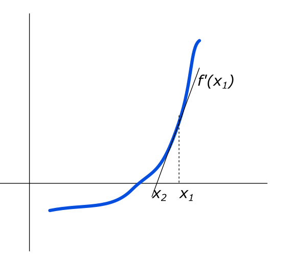 and draw the tangent line there. The place where the tangent line intersects the x-axis is the next guess, which as you can see in the figure is closer to the actual x-intercept.